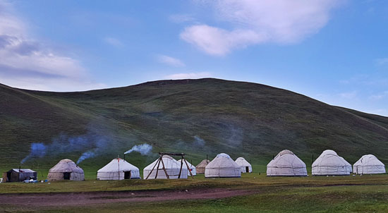 Podczas wyprawy rodzinnej do Kazachstanu i Kirgistanu w lipcu 2018 r. zaplanowaliśmy też mały wypad w góry. Celem było jezioro Song-Kol i spanie w Jurtach. Jezioro położone na wysokości 3000 m. n.p.m. Dookoła jeziora stepy i zaraz potem piękne góry, gdzie najwyższe szczyty sięgały 5 tys. m n.p.m. Szczyty łatwe z pięknymi widokami na duże jezioro Song-Kol z każdej strony otoczone górami. Atrakcji widokom dodają puste przestrzenie: co jakiś czas można spotkać Kirgizów na koniach, bo głównie w ten sposób tutaj się poruszają. Pełno pasących się koni, krów i owiec. Spotkaliśmy również jaki.